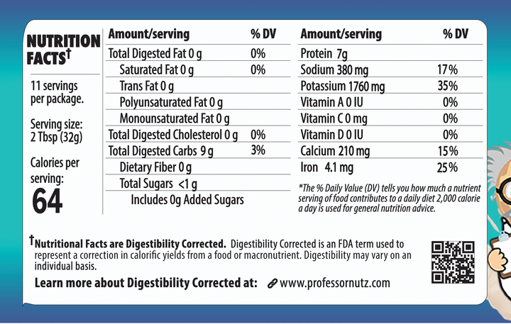 Professor Nutz™ has been “corrected” to digest very little fat or carbs. Our goal was zero. How much you actually digest will vary.